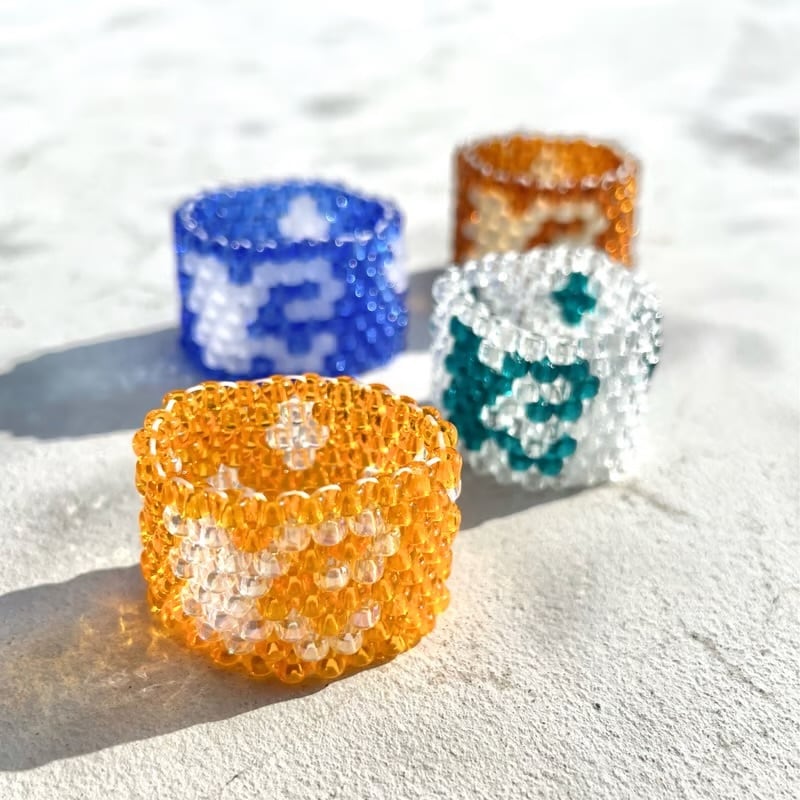 Imaginary Friend によるガラスビーズと安全ピンで仕上げたKロゴのリング